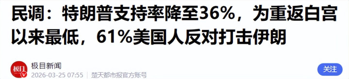 1.《民调:特朗普撑合手率降至36%,为重返白宫以来最低,61%好意思国东说念主反对打击伊朗》2026-03-25 07:55 | 开端:极目新闻