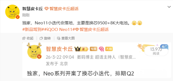 [CNMO科技音尘]3月30日,数码博主“贤慧皮卡丘”爆料称,iQOONeo11小迭代详情落地。新机将搭载天玑9500科罚器和8500mAh电板。