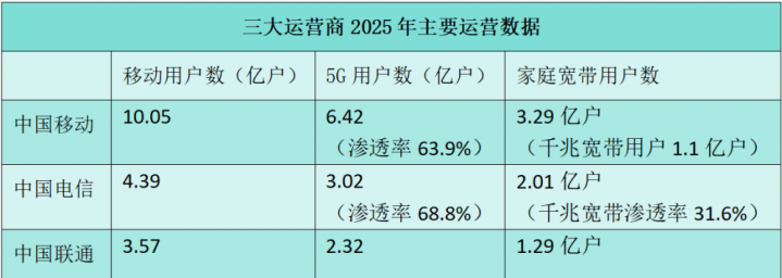 具体来看,中国出动2025年通讯奇迹收入7149亿元,同比下落1.0%,其汉文音和短业务收入赓续减弱,这一步田主要源于个东谈主与家庭市集的相配鼓胀。按捺2025年底,中国出动的出动客户数达到10.05亿户,险些袒护了总共潜在用户,客户数虽增长16.2%,但出动却从上年的48.5元降至46.8元。这意味着单纯的5G用户移动并未带来显贵的价值升迁,流量红利已耗尽殆尽。在家庭市集,尽管千兆客户数增长近10%,但家庭客户轮廓ARPU仅微增1.6%,宽带业务雷同堕入“增量不增收”的窘境。