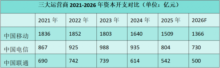 具体来看,中国出动2025年老本开支为1509亿元,同比下落8.0%,2026年中国出动老本开支缱绻为1366亿元,同比不绝下落9.5%;中国电信2025年老本开支为804亿元,较2024年下落14%,2026年中国电信全年投资缱绻730亿元,同比不绝下落9.2%;中国联通2025年老本开支542亿元,2026年瞻望进一步降至500亿元左右。