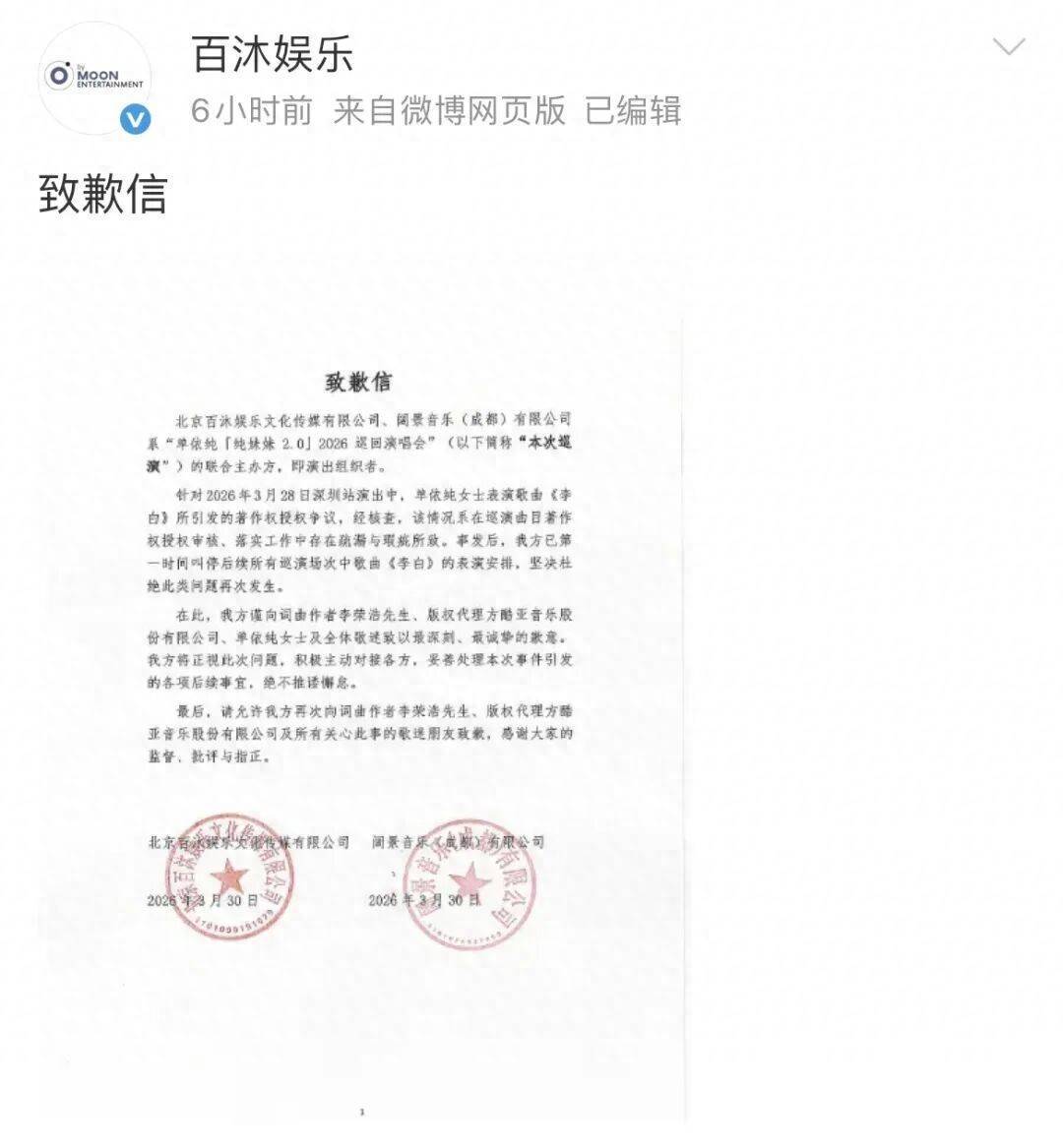 针对2026年3月28日深圳站上演中,单依纯女士扮演歌曲《李白》所激勉的文章权授权争议,经核查,该情况系在巡演曲目文章权授权审核、落实责任中存在嘱托与短处所致。事发后,自身已第一时间叫停后续所有巡演场次中歌曲《李白》的扮演安排,坚硬阻绝此类问题再次发生。