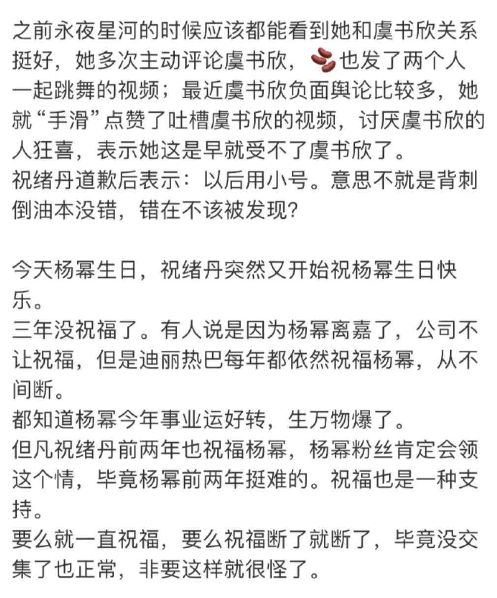 不仅对虞书欣如斯,网传祝绪丹对前辈杨幂亦然这般。