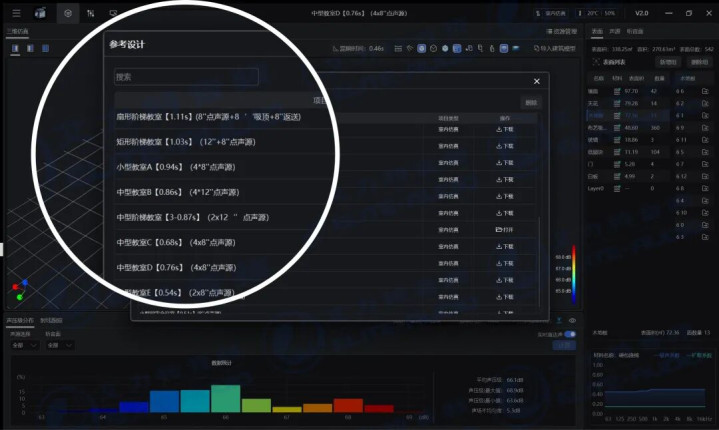 针对不同教室类型与教学场景,艾力特集合了丰富的参考联想有经营,用户可快速调用教室联想模子,承接空间要求、教学需求与系统确立,通过仿真分析提前评估声环境后果;在形貌落地后,再以现场测量和验收考证为依据,激动教室声环境确立参加可分析、可优化、可测量、可验收的施行旅途。