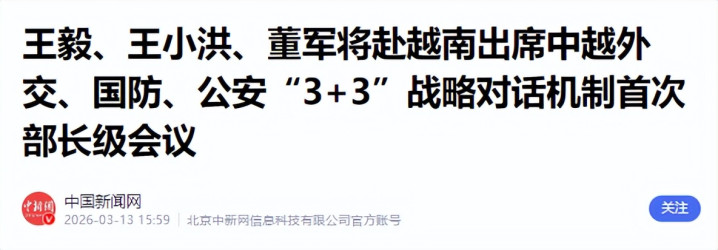 应越方邀请,中方外长王毅与公安部长王晓红、国防部长董军在3月15日至17日赴越南,开了一个名字很硬的会。