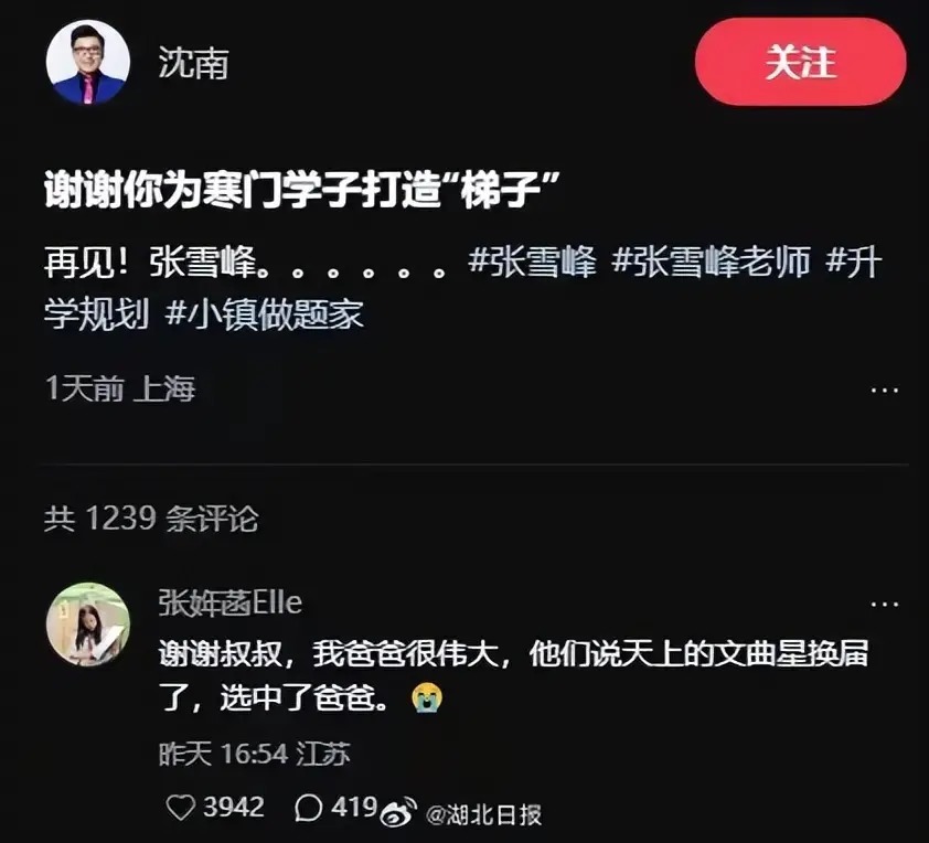 主捏东谈主沈南发文吊唁张雪峰,儿子张姩菡讲演:“谢谢叔叔,我爸爸很伟大,他们说天上的文曲星换届了,选中了爸爸。”这是一个11岁女孩用童真与诗意,对父亲离世作念出的最动东谈主解释,令东谈主潸然泪下。还好张雪峰留住了许多训诲视频,儿子想念父亲不错不雅看这些视频,抚慰独处的心。他曾许诺,但愿8年后儿子仍像10岁生辰时相同适意;也经营躬活动她填报高考志愿——如今,这些皆成了始终无法实现的缺憾。张姩菡莫得千里溺于悲痛,而是坚定地说“我爸爸很伟大”,这是对父亲一滋职业的最高服气。对离世的童话式意会:“文曲星换届”是网友对张雪峰“为寒门学子搭梯子”的上流譬如,她借用这句话,把耗费滚动为一种圣洁的提高,是孩子能预见最暄和的告别。她称沈南为“叔叔”,规定致谢,展现出卓著年事的懂事与体面。