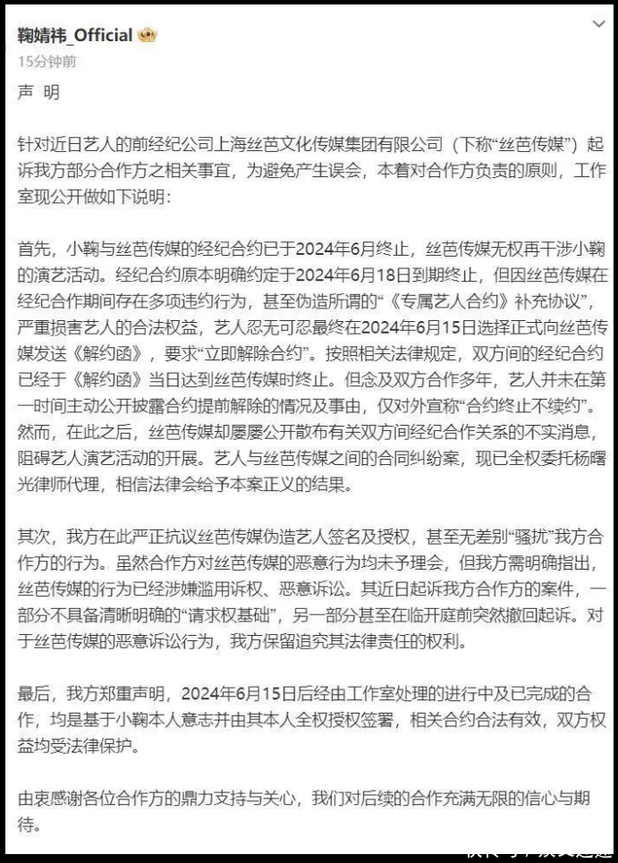 丝芭说两边合约到2030年,而鞠婧祎方面则咬定合约在2024年6月就还是到期了,况兼还控诉丝芭伪造文献。