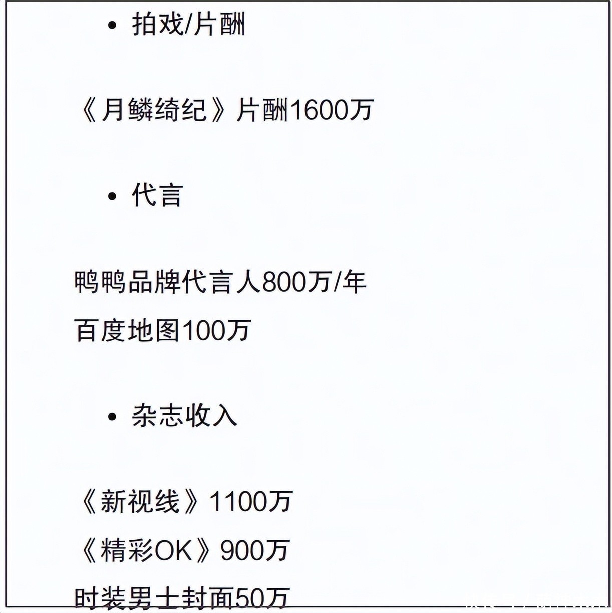 整理举报东谈主列举的鞠婧祎未信得过讲演收入表,网友相比感趣味趣味的部分是杂志收入和网剧片酬,列表潜入鞠婧祎《月鳞绮纪》片酬有1600万,杂志收入1100万,大型晚会高达百万一场,平时晚会步履一场平均在30到50万之间,握行步履一场30万控制。