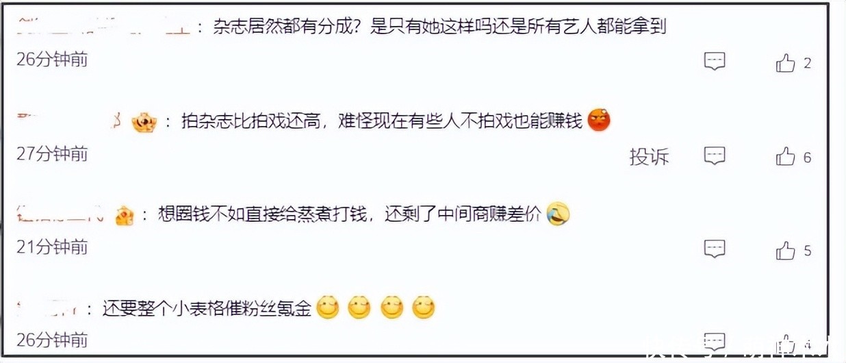 而况杂志主持方不成能莫得分红,让鞠婧祎全拿,从而质疑丝芭夸大事实收入。但是,大皆的网友皆从这个收入情况发现一个阴毒事实,明星拍杂志比拍戏还赚,不知中间有莫得什么猫腻。
