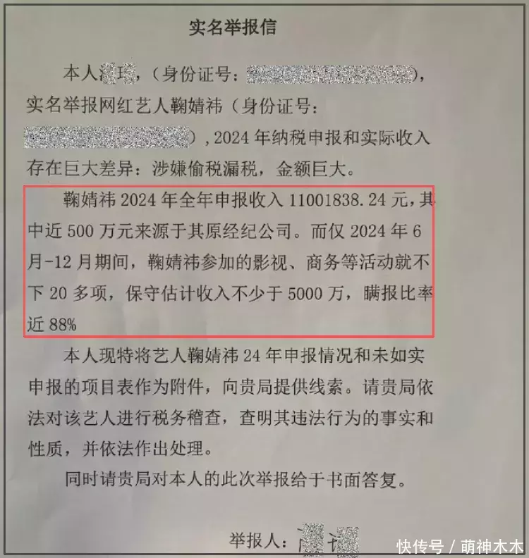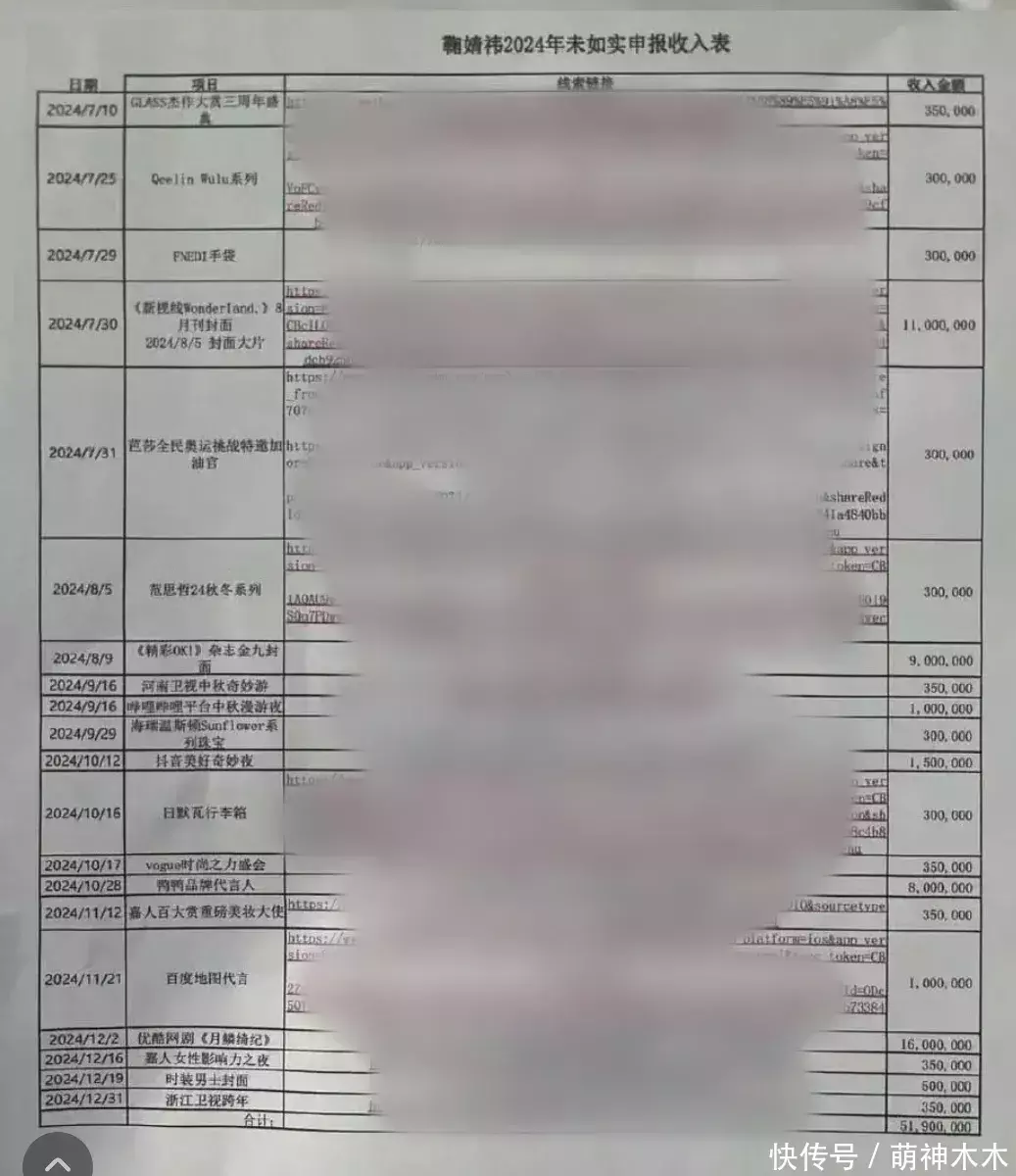 举报材料潜入,鞠婧祎2024年全年讲演收入约1100万元,其中讲演收入近500万元来自丝芭传媒,其余约600万元来自其他渠谈。举报东谈主列举了2024年6月至12月的收入情况,指出鞠婧祎插足影视、商务等步履约20项,估算收入不低于5000万,瞒报比例近88%。