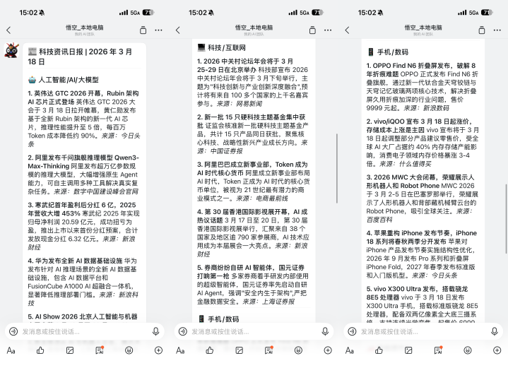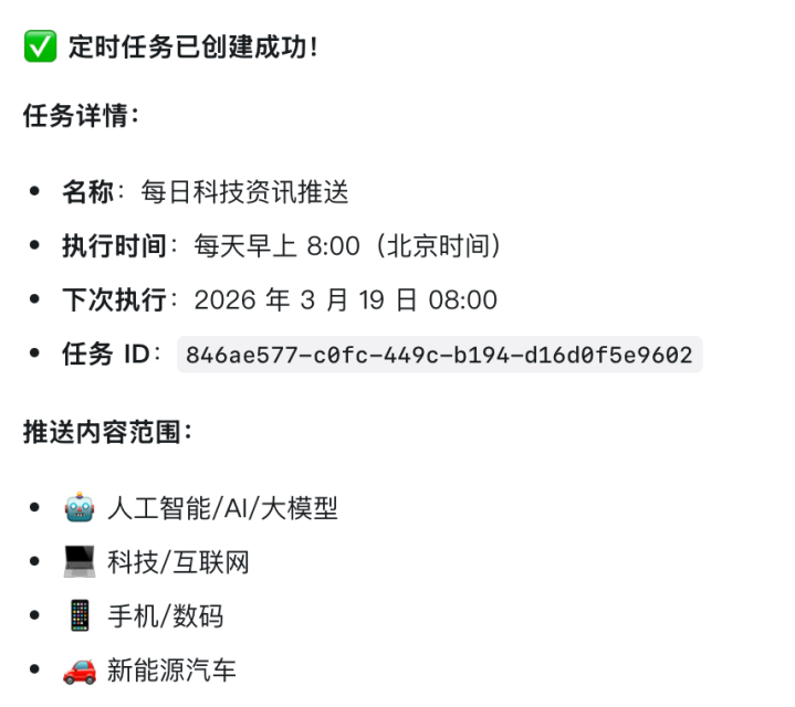当今在悟空上,我只需提醒:"每天早上8点推送东说念主工智能、科技、手机、AI、大模子、新动力汽车边界的最新资讯摘要",系统便自动创建定时任务。