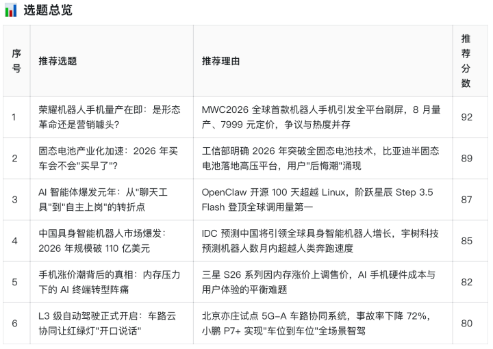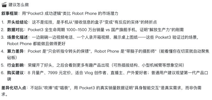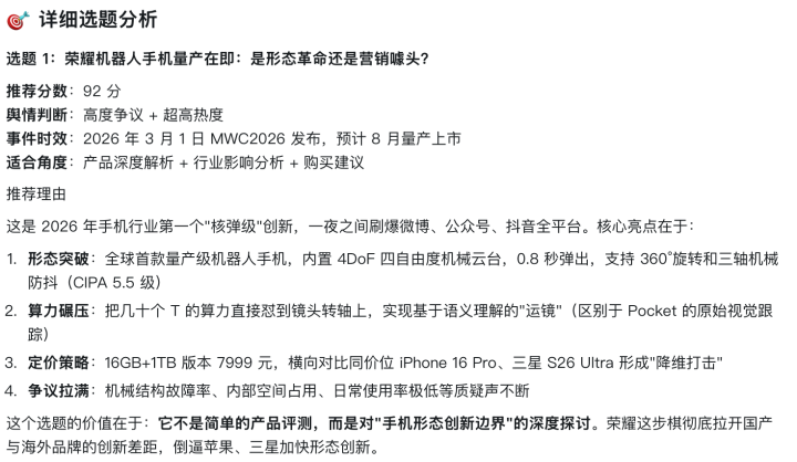 同期,悟空还会找出这个选题的中枢亮点和价值,比如荣耀机器东说念主手机这个选题,它判断这个选题的价值是拉建国产与国外品牌的改进差距,倒逼其他品牌加速情势改进。