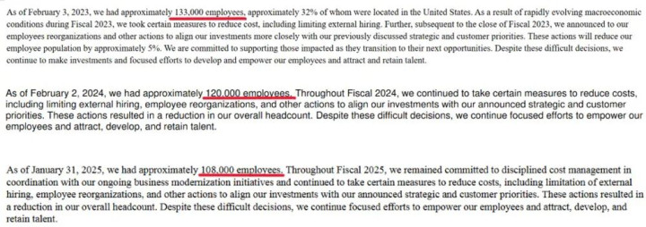 阐发戴尔提交的监管文献,这场东说念主员颐养的力度号称剧烈。数据显露,适度2026年1月31日,戴尔寰球职工总和降至约97,000名,相较于上一财年末的约108,000名,减少了11,000东说念主,降幅约为10%。