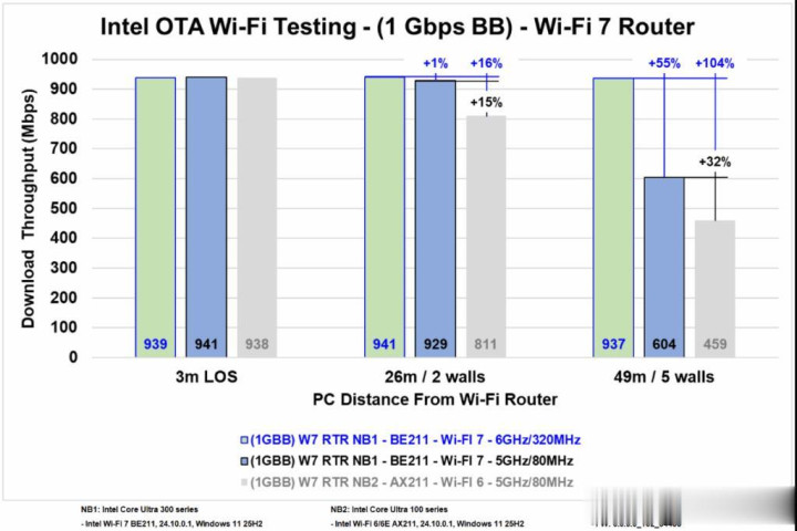 Intel最新OTA测试和CNET 2026实验室数据也说明:Wi-Fi 7在远距离、多墙环境下提高显然,但MLO孝敬有限,主要靠宽通说念和4K-QAM。