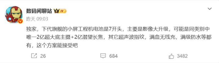字据博主数码闲聊站爆料,小米下代的小屏旗舰在影像上会有大幅升级,接纳2亿像素超大底主录像头+5000万像素超广角录像头+2亿像素潜望式长焦录像头,可能是同类别中的唯独。
