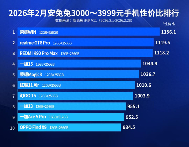 今天共享的是2026年2月安兔兔次旗舰性价比榜单,价钱区间是3000-3999元,最大的看点是部分机型的得手价钱依然高涨,有需求的小伙伴早买早享受吧。其中小米17跌出前十名,淌若按加价后的得手价钱,小米17投入榜单前十名如故挺淘气的。名秩序一的是荣耀WIN,得手价依然从3199元涨到了3499元,原因应该是部分促销和优惠券莫得了。