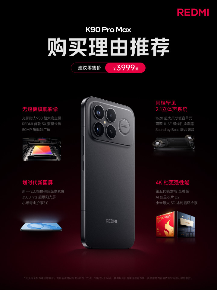 名秩序三的是红米K90 Pro Max,12GB+256GB版得手价3499元,是当今一丝数莫得加价的影像旗舰手机,16GB+512GB版得手价4299元。除了顶级性能除外,该机最中枢的卖点是2.1立体声豪华三扬,是当今智妙手机的音频天花板。其他确立也很旗舰:比如6.9英寸超等像素护眼屏、5X潜望式长焦镜头,7560毫安时电板+100W+50W双重闪充,还有满级防水、金属中框,超声波指纹识别和AI独显芯片Q2等等。
