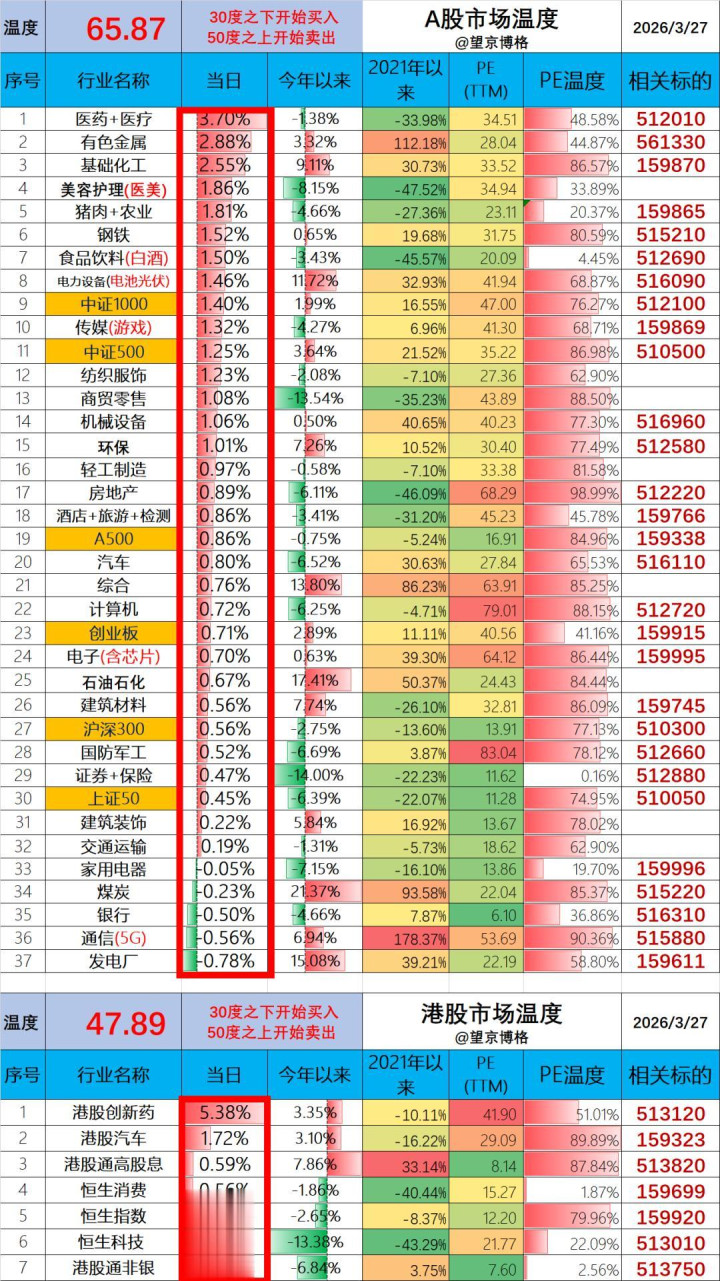 【博格的商场温度计】由「申万 31 个行业 + 6 个宽基指数」综共研究得出,上图细分列表中的 PE 温度,对应的是该行业/宽基的细分温度值。具体编制逻辑与使用要领,详见著作:这个商场温度计帮你拿握大盘涨跌