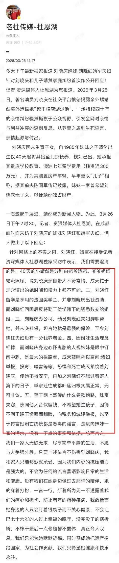 刘晓红屡次修起姐姐的作假音书,但刘晓庆方面一直未作修起。音书从刘晓庆发布的账号释出,当今几条动态王人已删除,身边莫得亲东谈主,刘晓庆会不会被东谈主挑拨把握很难说,其妹妹很缅思,但刘晓庆似乎不谋划和妹妹一家和好。自2025年2月起,刘晓红已屡次托福讼师周兆成发布声明,否定“吸血眷属”“财产侵占”“盼其无后”等坏话,并强调“不要一分钱,只思归来亲情” 。2026年3月,她更在承袭采访时震怒挑剔“悖逆天伦”的指控,称全家长久尊重姐姐,关系言论系自媒体为博流量持造 。