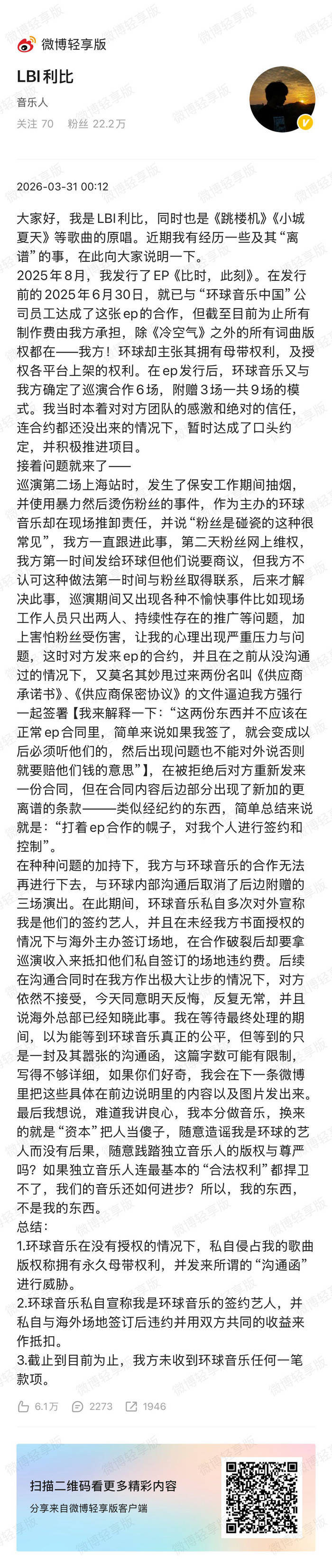利比的遭逢不是孤例。凭据他晒出的公约细节滚球app官网,2025年签约时两边明明商定“利比保留词曲版权”,环球却讲求声称领有“母带持久权力”。更离谱的是巡演法子:宣传海报上找不到艺东说念主名字,责任主说念主员少到要歌手我方搬修复,终末三场献技因“支配方原因”取消,公司反倒拿着“国外样子讲错”的借口赖掉悉数收入。这种“签了约就当遗弃掌柜,出了事就甩锅艺东说念主”的操作,在行业里早见怪不怪。就像何洁说的,索尼音乐靠《跳楼机》单月4000万版权费辞世,滚球app官网可这些钱有若干能流到创作家手里?