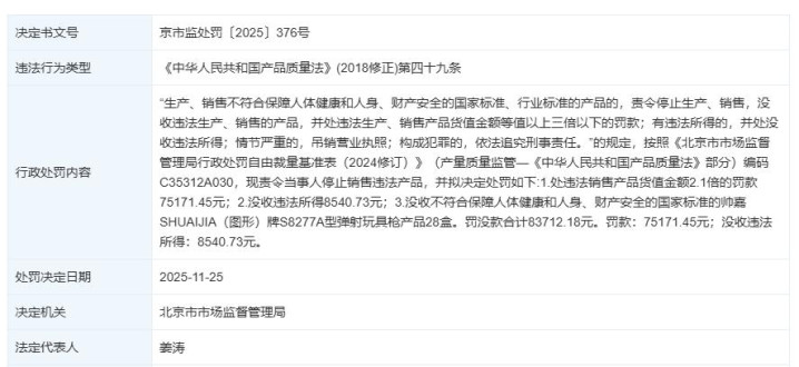 凭据行政处罚决定书“京市监处罚〔2025〕376号”,北京永辉超市有限公司销售的商标为帅嘉SHUAIJA(图形)牌S8277A型弹射玩物抢居品,经抽样闇练,所检式样机械与物感性能(平时使用)(蓄能弹射玩物)不相宜圭臬,判定抽查居品离别格。