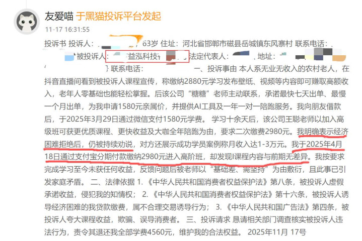 投诉平台显露,有老年投诉东说念主称,我方无业无收入,在直播间看到益泓科技宣传“发壁纸、视频等内容即可赚取高额收入”“老年东说念主零基础也能省略掌捏”的内容后,向一又友借债支付1580元膏火,随后对方建议缴费2980元可加入高阶班,该位老东说念主明确隔绝,示意经济贫穷,但对方仍接续“劝说”。最终老东说念主于2025年4月18日通过网贷分期付款的方式交纳2980元,滚球app插足益泓科技声称的“高阶班”,但发现课程内容与前期无各异。