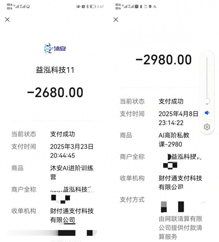 2025年3月23日、4月8日,李明父亲向益泓科技支付悉数5660元AI相关课程膏火的支付笔据。受访者供图