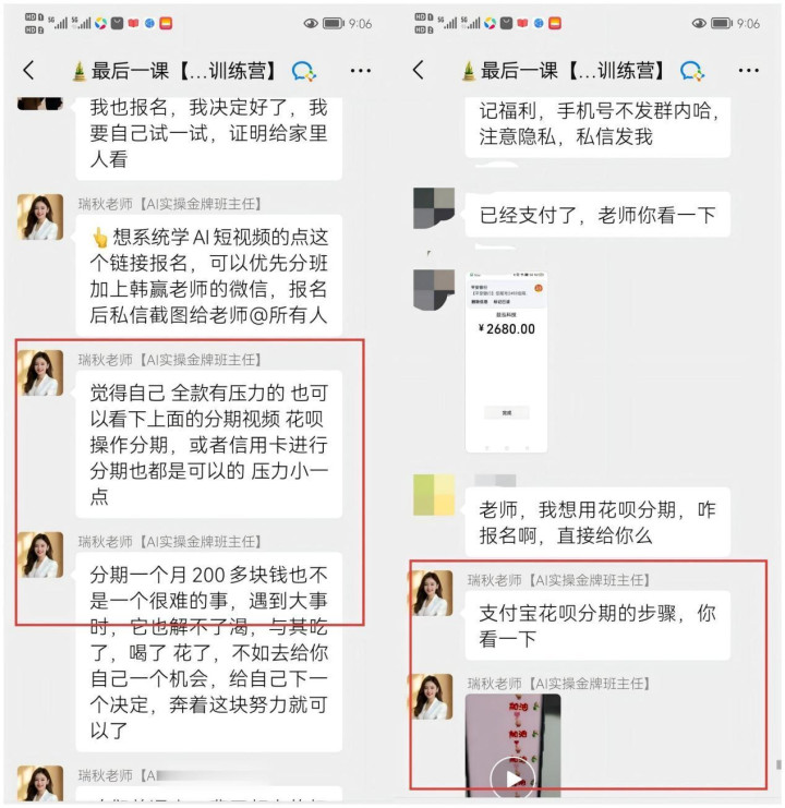 当一些学员示意雷同“全款有压力”时,群里培训“敦朴”会明确告诉他们不错使用信用卡分期或通畅花呗分期来支付,“敦朴”在群里不啻一次先容过通畅花呗分期具体操作法子的视频,同期也示意“分期一个月200多块钱也不是一件很难的事”。