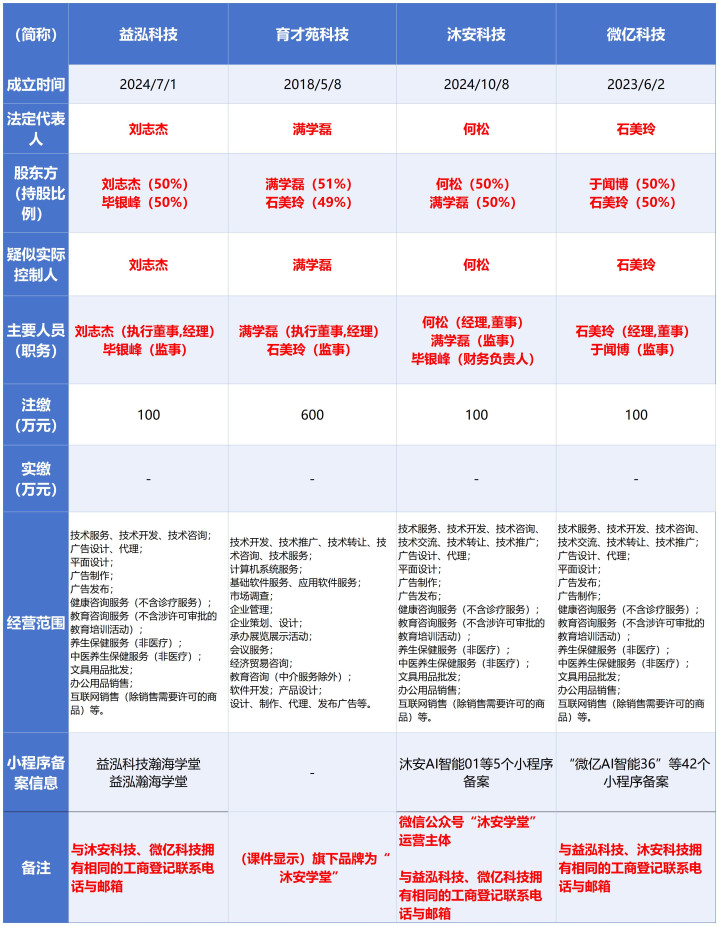 通过多重信隔绝叉对照,记者发现,益泓科技与另外两家公司——“微亿科技”“沐安科技”——关系密切。国度企业信用信息公示系统显露,益泓科技与微亿科技、沐安科技领有相似的工商登记企业研讨电话与邮箱。而沐安学堂微信公众号登记的企业称号显露,“沐安学堂”即为沐安科技。