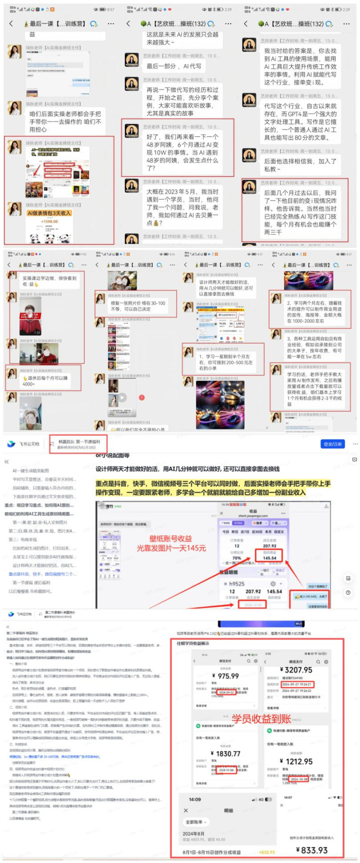 在微信群里,李明看到一些自称“AI实操金牌班主任”的“敦朴”大齐群发各式科技圈大佬谈AI的剪切视频,宣传“AI是当今最大的风口,亦然发展趋势”“你距离收成只差学会AI用具”等内容;在父亲购买的课件中,李明也耀眼到一个标题为“第二节课福利 韩赢院长”的云文档,其向学员先容的内容出现了“像社会热门、猎奇、感东说念主故事,婆媳矛盾等方面的内容很容易爆”等字样,并向学员展示疑似制作换头东说念主体艺术像片等,同期他们还以课件福利的方法传授学员“日入1000+收入法例”等技能。