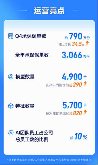 亮眼事迹背后,是元保在数据模子与技巧技艺上的捏续深耕,突然者全周期劳动引擎技艺不停强化。抑制2025年12月31日,元保模子集中已扩充至零散4900个模子和5700个特征,较上年同期永别新增超290个模子和820个特征。在AI技巧深度赋能下,公司运营效果与业务限制同步升迁,全年新保单数目达3066万份,同比增长36.7%,第四季度新保单数目约790万份,同比增长34.5%。