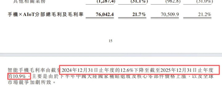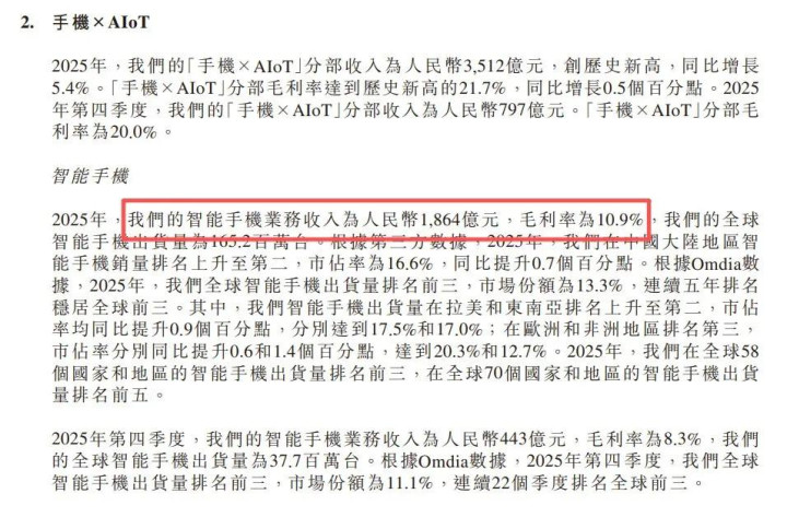 小米财报中对于手机业务这部分是这样刻画的:——“2025年,我們的智高手機業務收入為东说念主民幣1,864億元,毛利率為10.9%,我們的全球智高手機出貨量為165.2百萬台。”