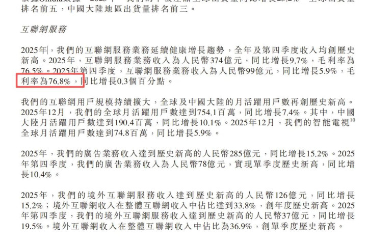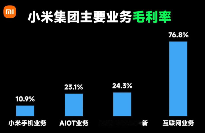 依托于小米手机和AIOT业务所产生的互联网就业这个业务的毛利率高达76.8%。
