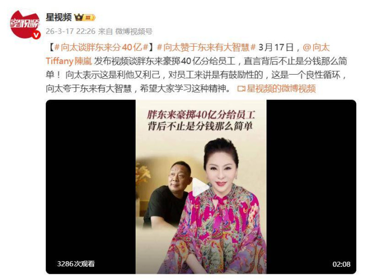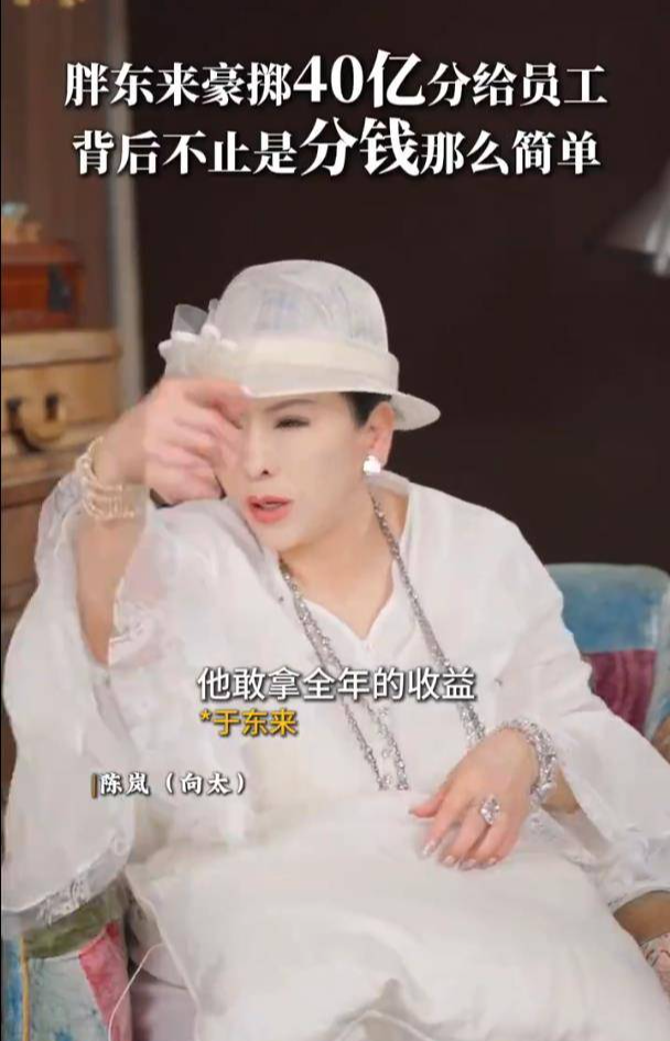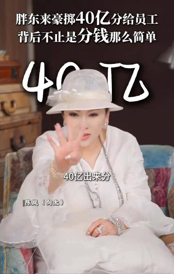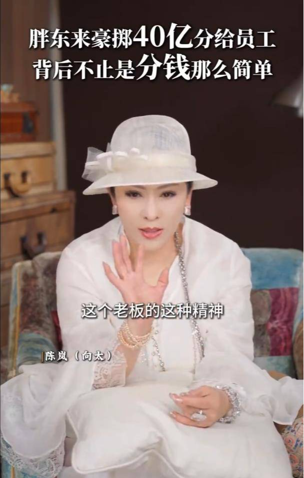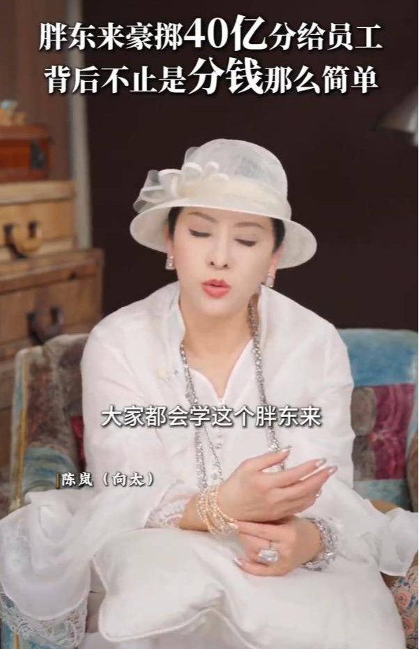 向太陈岚此次没聊珠宝豪宅,反倒为一家永久在热搜上的超市“站台”发声了。向太发布视频,特意谈起胖东来首创东谈主于东来豪掷40亿分给职工的“豪举”,直言这操作“有大机灵”,并隔空喊话企业主们:但愿世界学习这种精神!