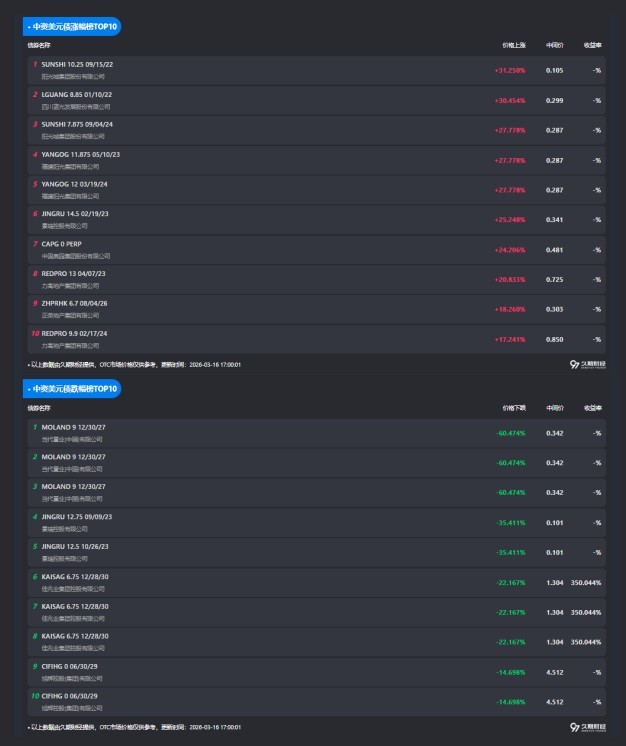 3月16日,中资好意思元债涨跌幅榜TOP10如下:
