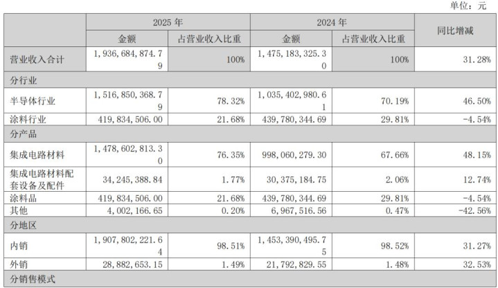 从业务结构来看,公司两大板块在2025年呈现显贵的分化态势。 当作功绩增长主引擎的半导体行业,全年结束商业收入15.17亿元,同比增长46.50%。上海新阳默示,业务增长主要成绩于集成电路制造用要道工艺材料产物时刻上风日益突显,产物类型不停丰富,新产物商场开发弘扬告成,客户订单握续增多。