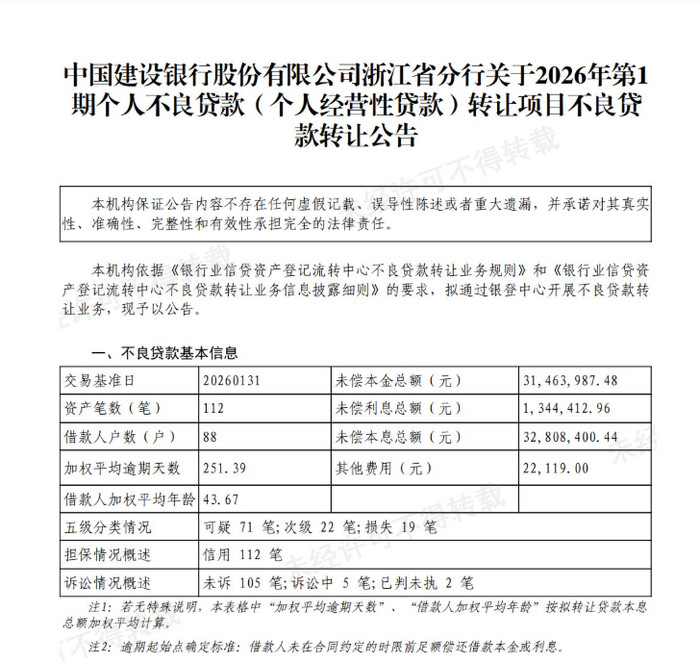 3月11日,建立银行挂出10则不良贷款转让公告,触及浙江省分行、河南省分行、江苏省分行等多家分行。其中,浙江省分行三期个东说念主不良钞票未偿本息总数计较2.76亿元,单期鸿沟诀别为0.33亿元、0.94亿元、1.49亿元。