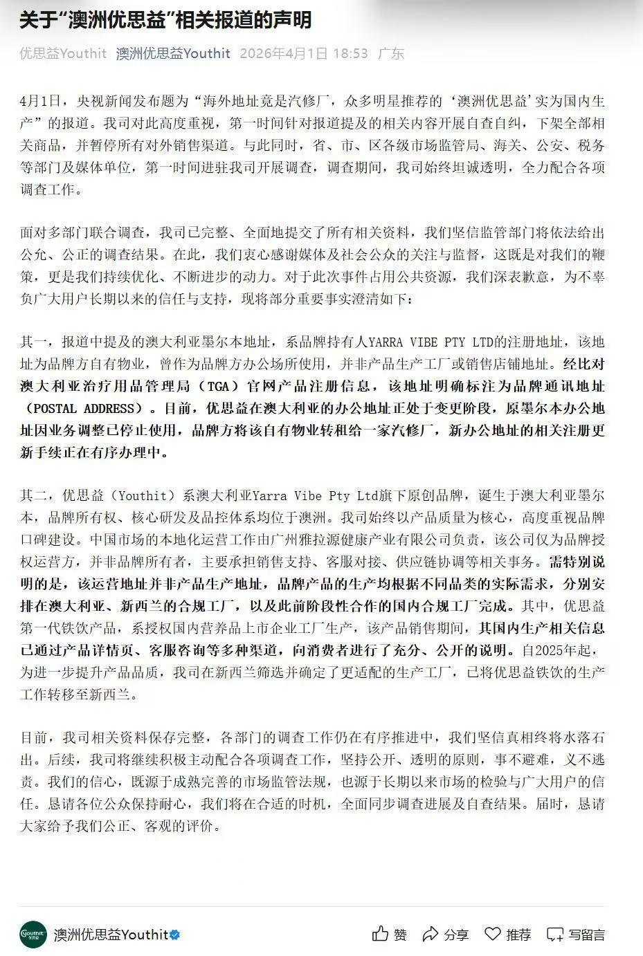 4月1日,央视曝光“澳洲优念念益”假造外洋产地、伪造品牌配景,所谓墨尔本工场实为汽修厂,居品实为国内代工坐蓐。