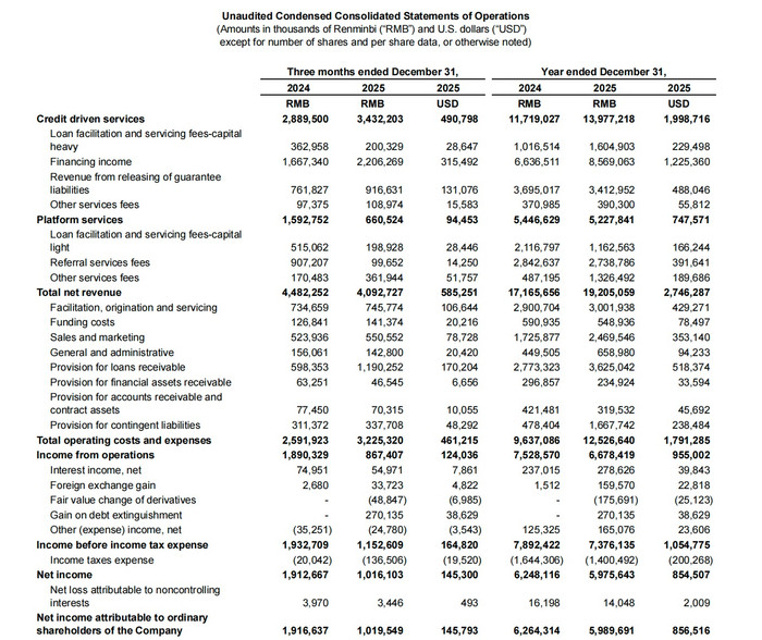又一家金融科技公司交出年度得益单!3月18日,在纳斯达克、港交所双重上市的信贷科技平台奇富科技发布2025年第四季度及全年未经审计财报。