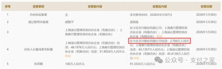 工商系统信息败露,上海辉聚企业贬责结伙企业(有限结伙)不久前发生结伙东说念主变更,拉卡拉支付股份有限公司在该次变更中进入结伙东说念主名单,出资额为2.784万元。