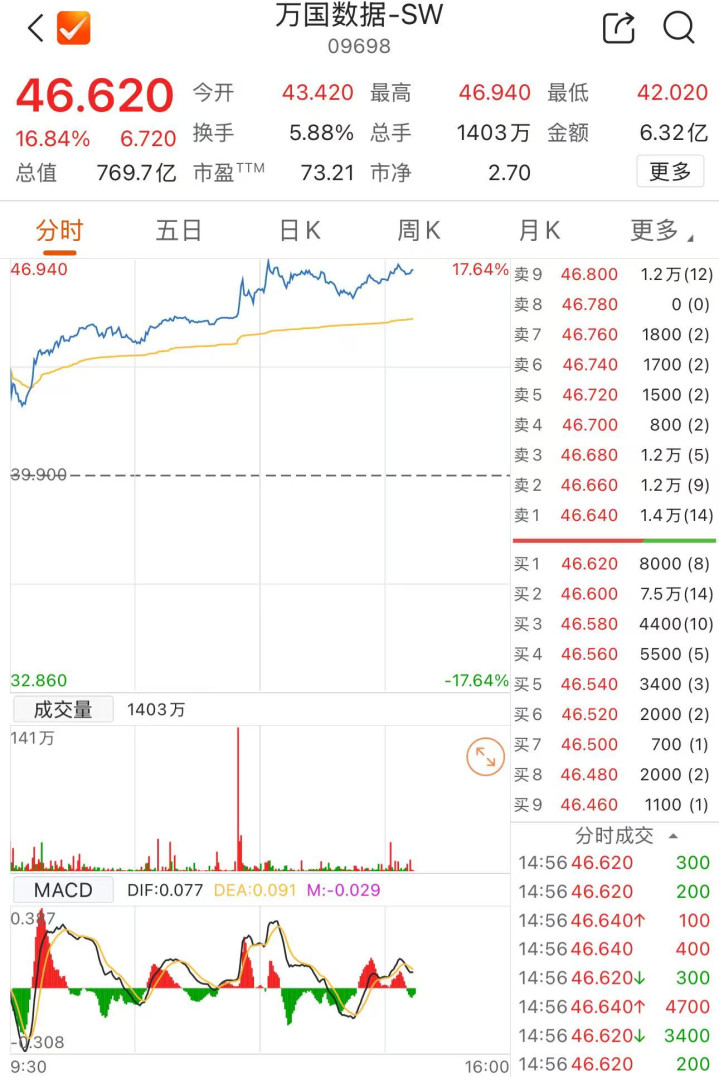 上证报中国证券网讯(记者杨子晏)3月18日午后,万国数据-SW涨幅扩大。抑止14时55分,万国数据-SW涨16.84%,报46.62港元/股,成交额超6亿港元,总市值近770亿港元。