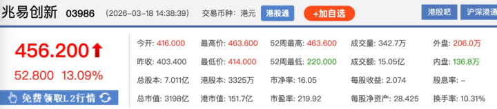 上证报中国证券网讯(记者杨子晏)3月18日午后,港股半导体板块走强。禁止14时38分,兆易立异H股涨13.09%,报456.2港元/股,成交额约15.05亿港元,总市值约3198亿港元。