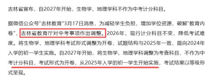 “吉林省训诫厅率先在全省官宣中考更动,对生物、地舆两门学科的考核格式进行全面疏通。”