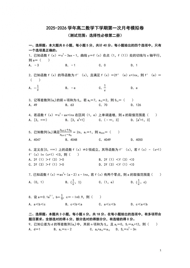 滚球app 2025-2026学年高二数学放学期第一次月考模拟卷