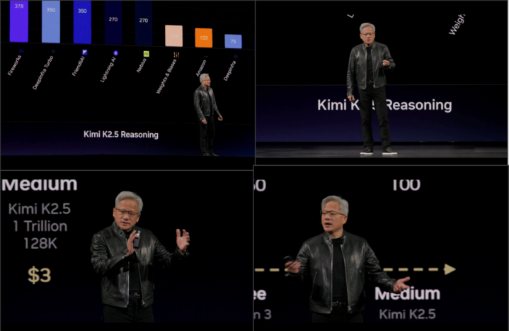 3月17号,Kimi 模子继岁首的 CES 2026 之后,在黄仁勋的 GTC 2026 主旨演讲中再度成为英伟达展示下一代芯片和推感性能的御用模子。