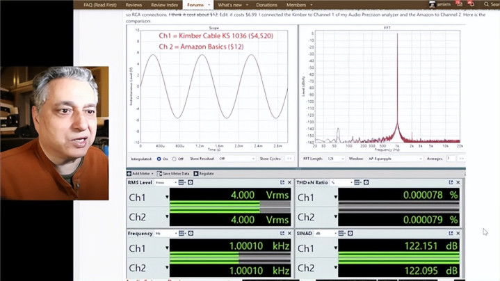 著明音频测评频谈Audio Science Review的Amir实测对比,售价4100好意思元(约28369元东谈主民币)的Kimber Kable KS 1036发热级RCA音频线,与6.76好意思元(约46元东谈主民币)的Amazon Basics普通RCA线,在科学仪器检测下浮现全王人一致,在音质层面也并未展现出任何可量化的上风。