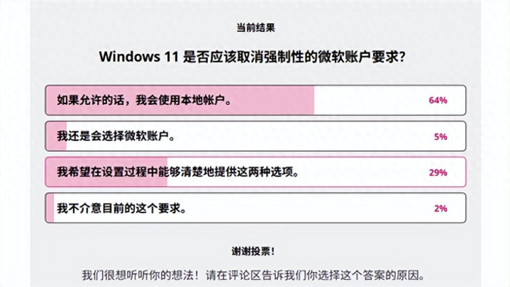 WindowsCentral资深裁剪ZacBowden随即发升引户拜谒,效果露馅64%的受访者明确暗示若有摄取会优先使用土产货账户,29%但愿同期保留两种登录边幅,仅有5%会坚合手使用微软账户,仅2%对强制战术无异议。