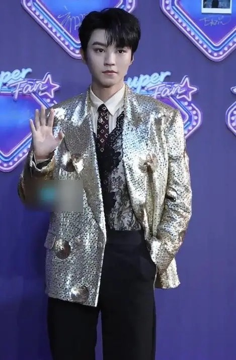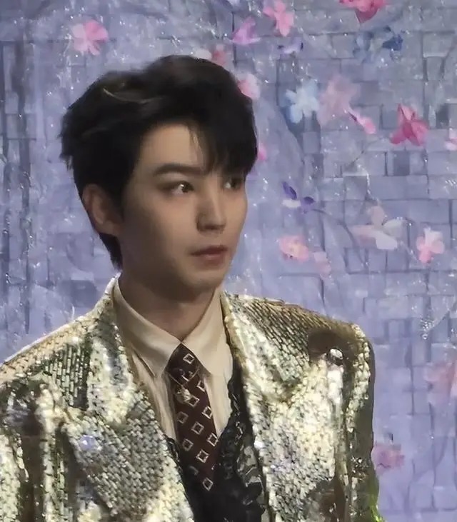 他身着幽静金色亮片西装,西装为修身模样,搭配一条暗红色领带,领口处还别了一枚银色胸针,单看模样,贵气完全,充满了典礼感,适合他压轴的身份。