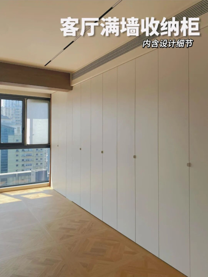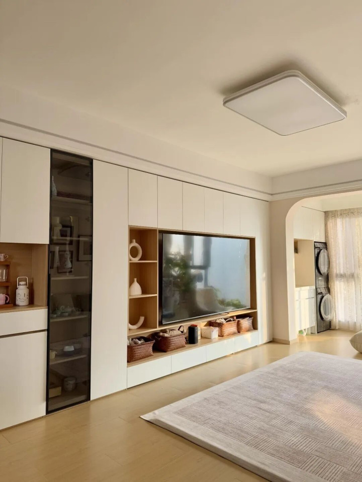 这是年青东谈主追捧的一种作念法,把作念电视墙的钱拿来作念满墙柜,平直措置居家收纳乱的艰苦。家里的杂物、玩物、零食,填塞能塞进去,柜门一关,客厅立马一干二净,看着就舒坦。