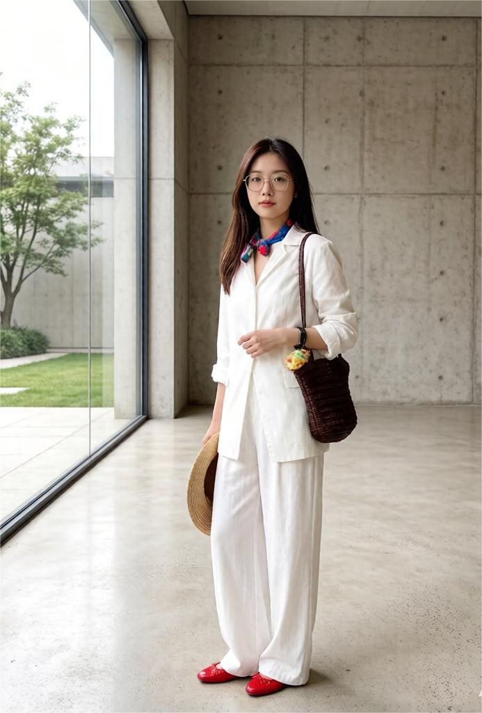 在配饰选用上,丝巾、包包不行或缺,宇宙不错选用红色包包或玄色包包与之搭配,也不错选用深蓝、军绿色丝巾与全白造型搭配。