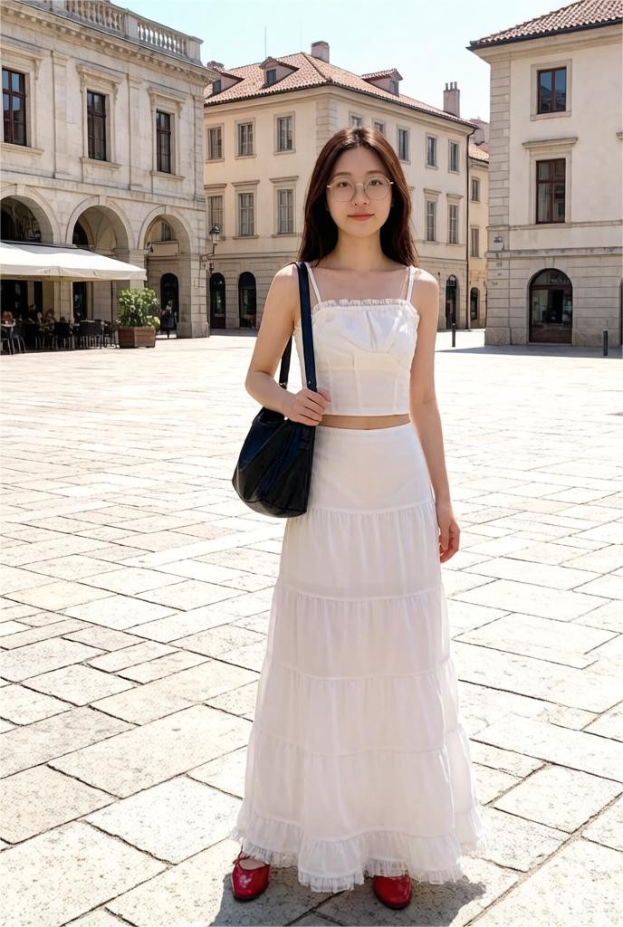 白色紧身露脐款吊带背心搭配纯白色高腰及踝半裙,公主范透顶。